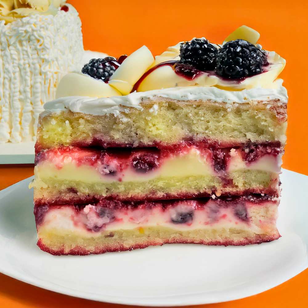 A massa é uma explosão de texturas, com pedaços suculentos de amora em cada mordida. O recheio de Brigadeiro Branco cremoso é simplesmente irresistível.